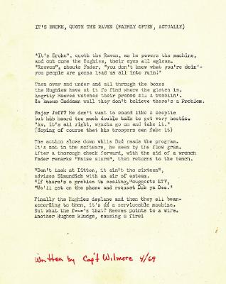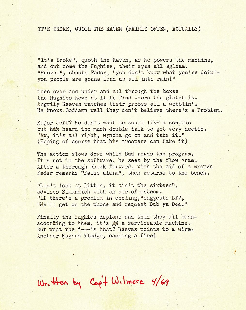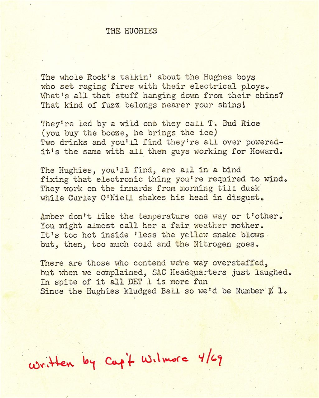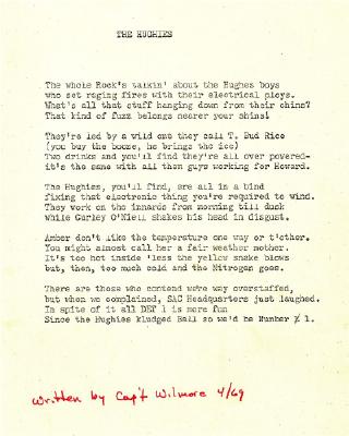 Duncan Wilmore was an Electronic Warfare Officer (EWO) assigned to Lisa Ann (Project 863) / Rivet Amber. Dunc has a great sense of humor and liked to rib the tech reps whenever possible. Below are two poems by Dunc aimed at "The Hughies". Both poems were provided by Budd Rice who worked for Hughes Aircraft as a lead engineer that supported Rivet Amber. |