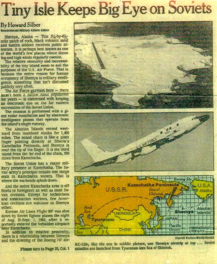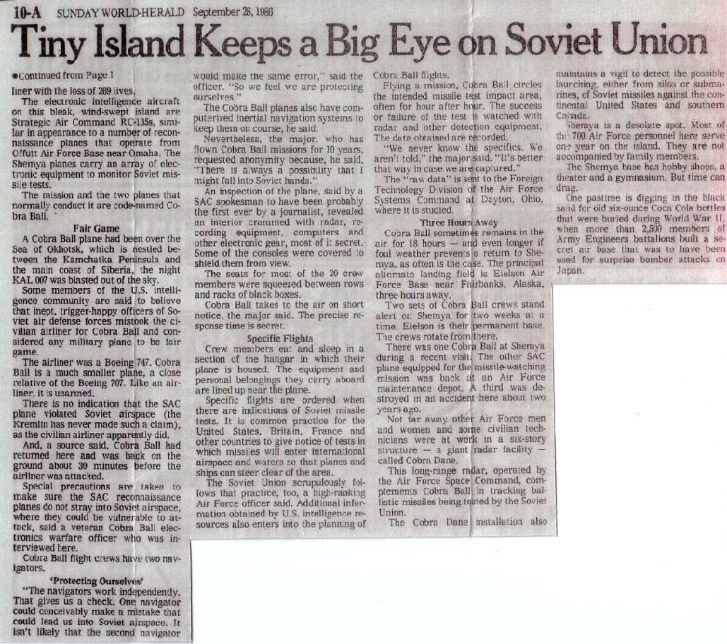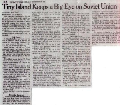 Hi Res The article above was published in the Sunday edition of the Omaha World Herald on 28 September 1986. It's a short story about Cobra Ball operating from the island of Shemya. Compliments of Robert C. "Clay" Jones. Clay served as an Inflight Maintenance Technician (IMT) aboard Rivet Amber in 1968. He would like very much to communicate with Rivet Amber crew and staff. Contact: clayjones38@msn.com |