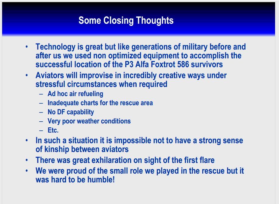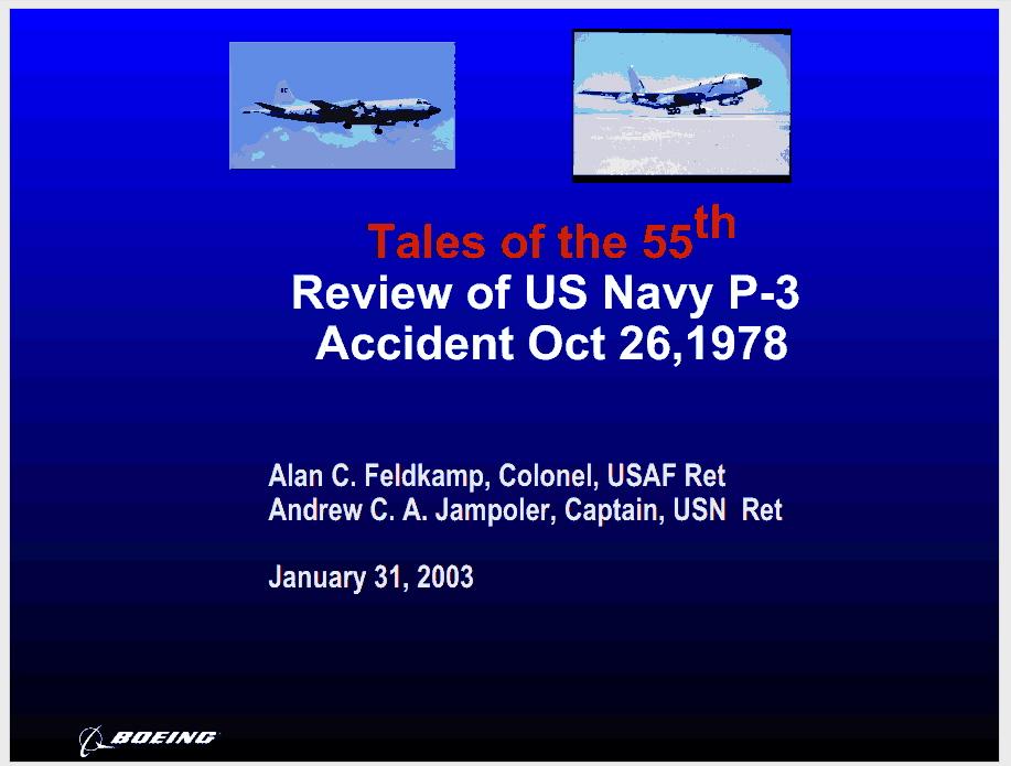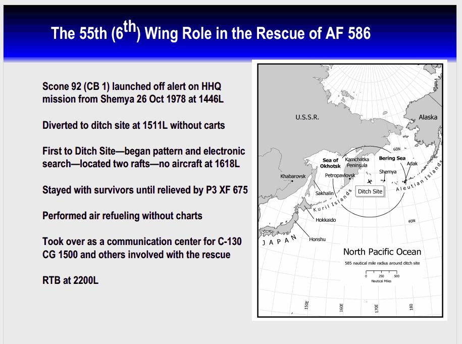 Hi Res On 23 April 2013, Colonel Alan C. Feldkamp, USAF (Ret.), sent me an interesting article that was published in the June 1979 issue of SAC Combat Crew magazine. It's his story about the rescue of a US Navy P-3 Orion crew that ditched in the Bering Sea in October 1978. When Col. Feldkamp wrote this story he was a young Captain flying highly classified "Cobra Ball" (RC-135S) reconnaissance missions from the remote island of "Shemya" in the Aleutians. His crew position on "Cobra Ball" was "Electronic Warfare Officer, Crew Commander", aka "Tactical Coordinator" (TC). Click Here for a pdf version of Alan's story. Click on the following links for scanned pages in jpg format: 1, 2 Click Here for PowerPoint briefing slides used by Col. Feldkamp (USAF, Ret.) and Capt. Jampoler (USN, Ret.) on 31 January 2003 when they told their story at the annual "Tales of The 55th" event. Click on the following links for PP slide in jpg format: 1, 2, 3, 4, 5, 6, 7, 8 Another source of information related to this accident / rescue is a book written by Andrew C. A. Jampoler. The title is "Adak: The Rescue of Alfa Foxtrot 586". Click Here for Andrew's book on Amazon.com alanfeldkamp@gmail.com |