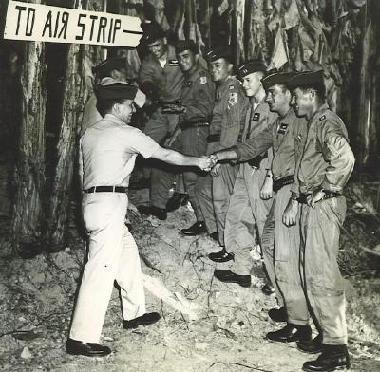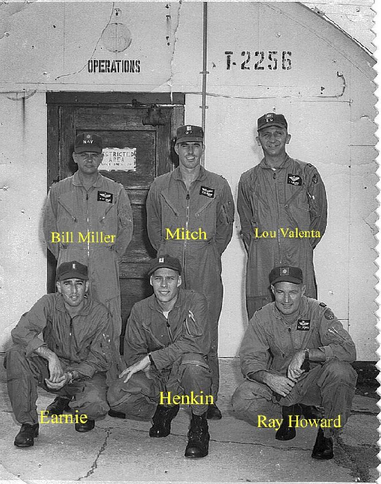 Hi Res L-R: Dale - Lloyd - Navarro - Carey - Hensley - Mitch Mitch's 47 crew arrives in Vietnam wearing their new hand made gunbelts and holsters (Mitch is on the far right). The crew had decided to make their own gunbelts and holsters for this mission. Typical of them, they did nothing in half measures. They promptly purchased bulk leather, dyes, tooling stencils, mallets and other necessary equipment. The next stop was Pat's kitchen where they liberated a number of her cooking pots, strainers, spoons and such. Also necessary equipment required for the mission ahead. They set up the lab in our basement which assured that the incredible odors of boiling leather, dyes and constant tapping in of designs could waft into the living areas above. These commotions kept Pat in a constant mode of eyes rolling to the heavens and mumbling something about spaghetti strainers, crazy people and some other stuff us kids were not suppose to hear. Of course, each version had to be better than the last and the competition became quite fierce. In the end, all obstacles were overcome and another successful mission put in the bag. Notice also the reversed 'R' which was meant to confuse the enemy who did not handle r's very well. Michael G. Michaud |