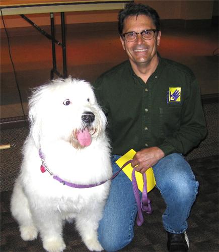 Gordon Krentz, the director of special events for the Nebraska Humane Sociecty, provides the program for the Kiwanis Club of Omaha Golden K June 4. With him is Jane, his adopted sheep dog mix.