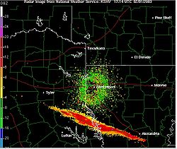 - 9:05: Residents of north central Texas, particularly near Tyler, reported a loud boom, a small concussion wave, smoke trails and debris in the clear skies above the counties east of Dallas.