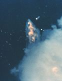 At T+73.124, the aft dome of the liquid hydrogen tank failed, producing a propulsive force that pushed the hydrogen tank into the liquid oxygen tank in the forward part of the ET. At the same time, the right SRB rotated about the forward attach strut, and struck the intertank structure. This resulted in the spontaneous conflagration of the fuel which exploded the external tank, creating a massive plume of water vapor exhaust that enveloped the entire stack.