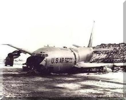 | A look at Rivet Ball sitting at the bottom of the 45' cliff on the day after . . . one of the guys escaped through the crack in the fuselage at the left wing root . . . all 18 crew members walked away USAF photo  |