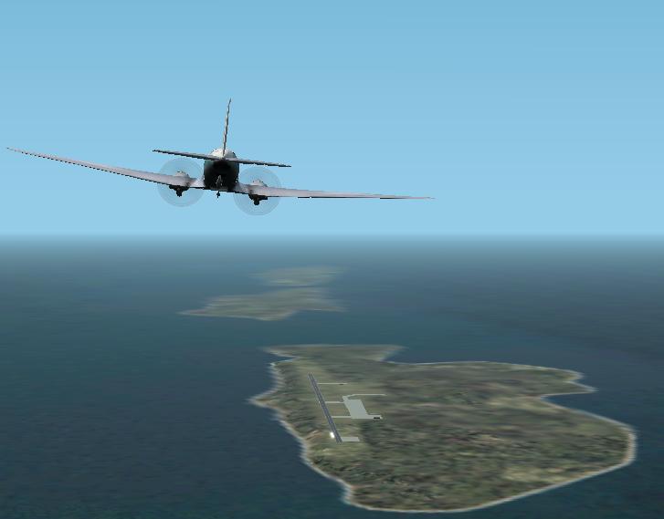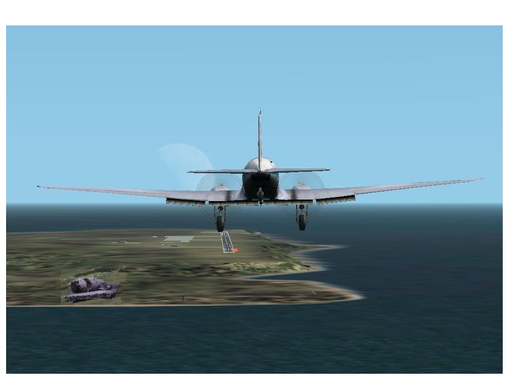 | During the charter I ignored the ILS to Rwy 28, entered downwind for Rwy 10 and here I am on final. If you look closely, toward the bottom left, you'll see the remains of the RC-135S sitting in the "Million Dollar Dump" on the west end of the island  Don't look for the wreckage in your version of Flight Simulator, this one only appears on my computer. An examination of the wreckage will tell you I did a copy / paste to the original screen shot :-)  |