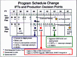 - IFT-6, which was originally supposed to happen before the Deployment Readiness Review, is now scheduled shortly thereafter. The planned test in late July 2000 slipped to the Fall of 2000 and is now scheduled for late 2001. This test will be the second Integrated System Test of all NMD elements in the initial capability except for the interceptor booster.