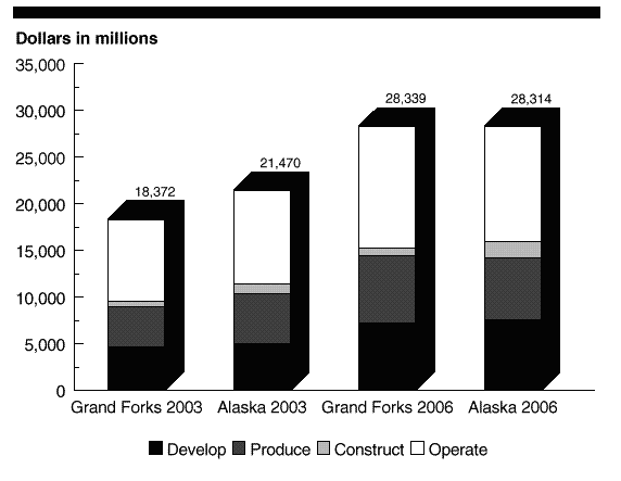 the fiscal year 2000 deployment review. To provide a basis for estimating near-term funding requirements, the program office prepared four different life-cycle cost estimates, based on two locations--one at Grand Forks, North Dakota, and the other in Alaska--and two capability levels--one available in fiscal year 2003 and the other in fiscal year 2006 [an initial operating capability would be established in fiscal year 2006, and the full operating capability would be achieved in fiscal year 2009.]. The life-cycle cost estimates