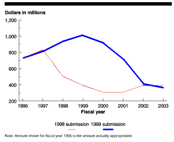 In fiscal years 1996 through 1998, Congress authorized and appropriated a total of $1,174 million more than the President's budget requests for those years. The fiscal year 1999 funding estimate does not include amounts that will be needed beginning in fiscal year 2001 to develop system improvements to keep up with changes in the threat. About $765 million above the President's fiscal year 1999 budget estimate will be needed in fiscal years 2001 through 2003