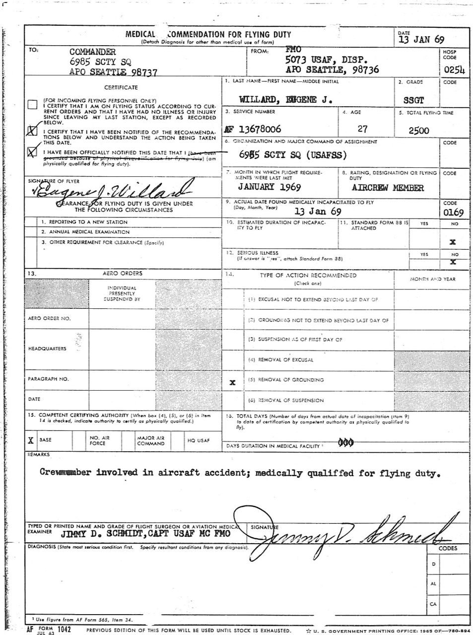 Hi Res Click on the following links (1, 2, 3, 4) for high resolution scans of the USAF Accident Report (HQ AFSC/JA) provided by Eugene J. Willard on 12 January 2009. Gene was the Airborne Mission Supervisor (AMS), aka "Lucy" in charge of Security Service backenders. He was aboard Rivet Ball when she hydroplaned off the end of runway 28 on 13 January 1969. by Capt. Robert L. "Viper" Brown (Part-2, Rivet Ball Landing) Things were looking up. Rivet Ball was going to Beale for a compass swing. I'd asked if I could go along and was told by Colonel Ratto that I could if my squadron approved it. I called Eielson and got approval from our Ops Officer, Captain Lammers. It would be good to go to California for a few days, get away from the Alaskan winter at Shemya and, even worse, at Fairbanks. We ordered flight lunches for the trip and put them on the aircraft. We were supposed to leave for Beale at 8 PM but at 7:30 that was cancelled due to impending activity that had to be covered. We took off a little after 8 and flew our mission. Returning, we had pretty bad weather but we were used to that. Coming down the runway, it appeared we weren't slowing down and I remember our maintenance man, Richard Steen, saying there goes Hangar Two as we roared past her. Major Achor tied down the alarm bell and we all strapped in. We were lucky we landed the way we did as we went past the end of the runway over a cliff and crashed into sandy ground; had we landed the opposite way we would have encountered rocks and most likely there would have been explosions and we all would have perished. As it was, when we came to a complete stop, we crew members in the rear went to the escape hatch. Those flight lunches were all over the place. Steen, ever helpful, opened it and then, for a few seconds, no-one did anything, so I ripped the escape rope from its position over the hatch and told them we go out using it and we did. It was dark out there but we all managed to find each other and eventually a van or more gathered us all and took us to the flight surgeon who grounded us. He also, kindly, gave us all a shot of whiskey which I didn't even feel. We then went back to an empty hangar. The next day we went back to Rivet Ball and gathered what classified material we could. Gene Willard aka "Lucy" starmilkman@rocketmail.com 13 January 2009 PS: Richard Steen was on Rivet Amber, #62-4137, when she vanished over the Bering Sea on 5 June 1969 with 19 souls aboard. |