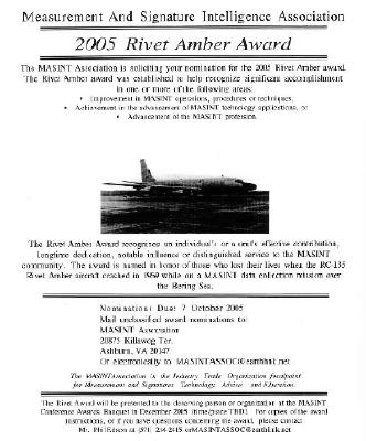 Hi Res The MASINT / ATIA Association is the Industry Trade Organization focal point for Measurement and Signatures Technology, Advice and Education. Measurement and Signature Intelligence (MASINT) is technically derived intelligence data other than imagery and SIGINT. The data results in intelligence that locates, identifies, or describes distinctive characteristics of targets. It employs a broad group of disciplines including nuclear, optical, radio frequency, acoustics, seismic, and materials sciences. Examples of this might be the distinctive radar signatures of specific aircraft systems or the chemical composition of air and water samples. The Central MASINT Organization, a component of DIA, is the focus for all national and DoD MASINT matters. Click Here for information about the "Rivet Amber Award" and more. |