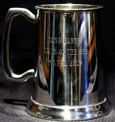 My Display Table was one of many. It consisted of memorabilia from Shemya, a large 8x10 photo album, Movie Clips from a home movies we made in 1968-69 and a Slide Show. The Movie Clips show a reenactment of Rivet Ball's fatal landing on 13 January 1969 and the last recorded images of Rivet Amber as she departs Shemya about two weeks before vanishing over the Bering Sea on 5 June 1969. The Slide Show consisted of images from my website, "A Tale of Two Airplanes" @ www.RC135.com. One hour into the program I gave a Briefing about Rivet Ball, Rivet Amber and Shemya. At the end of the program Tankards were given to guest speakers by event organizer and master of ceremonies, Colonel James W. "Jim" Thomas, USAF (Ret.). Movie Clips Slide Show Briefing (Part-1 of 3) Briefing (Part-2 of 3) Briefing (Part-3 of 3) Tankards Tankard |
