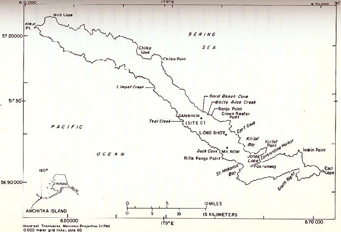 Geology: "Amchitka Island is one of many islands of the Aleutian Island chain in western Alaska. Amchitka Island, 55 km long and 5.5 km wide, lies in the western portion of the Aleutian Volcanic Arc which developed geologically about 55 million years ago. New knowledge about plate tectonics along with current observations show this region to be one of the planet's most dynamically active geological regions. More than 90 percent of the seismic energy recorded within the United States during the instrumental record was within the Aleutian Volcanic Arc. For example, magnitude-8 earthquakes occur at approximately decadal time intervals along the Aleutian arc, with three of the six largest earthquakes occurring between 1957 and 1965. Amchitka Island is located at 51° 32' N Latitude, 179° 00' E Longitude and has an approximate area of 300 km." History: "American troops landed on Amchitka to establish The Naval Air Facility on 24 February 1943. To make way for them, the U.S. forcibly evacuated the local Aleuts and interned them thousands of miles away. Near the end of World War II, Amchitka Island was an advance location for planning the invasion of the northern islands of Japan (the Kuriles). The south-eastern portion of the island had buildings to house an infantry division of about 13,000. At this time Amchitka had three runways. "Fox" was shortest and closest to what is now Constantine Harbor. "Charlie" and "Baker" were longer, and with "Charlie" at 10,000 feet in length, it was at that time the world's longest runway. By 1949-1950, the Air Force presence on Amchitka had dropped to about 40. During the postwar period, Amchitka Island was a military outpost to provide a radio range station and alternate landing site for aircraft flying the Aleutian Islands. It was also a weather monitoring site for Russian weather reports where six full time radio operators monitored Russian weather broadcasts. Between 1950 and 1961 Amchitka Island was used in the Distant Early Warning network. Between 1965 and 1971 Amchitka was the site for underground nuclear testing. Between 1986 and 1993 it was used for construction and operation of the Relocatable Over the Horizon Radar. Amchitka today is uninhabited, but residents of villages on other islands sometimes hunt for marine mammals or fish near it. Seals, fish and other marine life migrate among the islands. Presently, Amchitka Island is a National Refuge." Underground Nuclear Testing: "Amchitka Island is the site of three underground nuclear detonations conducted on 29 October 1965 ("Long Shot"), 2 October 1969 ("Milrow"), and 6 November 1971 ("Cannikin"). Long Shot was detonated at a depth of 700 meters and had an 80 kiloton yield. It was detonated shortly after a nearby magnitude-8.7 earthquake to determine whether monitoring techniques could differentiate between natural seismicity and nuclear explosions. Milrow was a seismic calibration test detonated at a depth of 1,220 meters with an approximate one megaton yield. Cannikin, a test of the proposed Spartan missile warhead, was detonated at a depth of 1,790 meters, with a yield slightly less than five megatons. Data from the Nevada Test Site shows what happens following underground nuclear tests. Upon detonation, nearby rock vaporizes, or melts into a puddle of magma on the floor of the explosion cavity. Part of this magma turns to glass. The roof of the cavity then collapses in a second wave of fracturing forming a chimney to the surface. The shock from the detonation causes extensive fracturing well beyond the blast site. Most radionuclides remain within the magma-turned-glass cavity. Some radionuclides move up with the silicate vapor from the vaporized rock and then settle within the collapsed chimney. Today, one of the key areas of investigation for Amchitka is whether groundwater percolating through the areas may carry radioactive materials towards the ocean. This is the focus of the research described on these web pages. Of the three Amchitka tests, only Cannikin produced any surface expression that is obvious today. The Cannikin explosion extended out through existing geological faults and drove from them groundwater which some observers reported seeing shoot up 20 feet from the land surface. Within two days of the detonation, a crater formed almost 2 km wide and 12 m deep. Near ground zero Cannikin was measured at magnitude-6.8 and the largest subsidence event that followed was 4.9. Subsidence and faulting dammed nearby White Alice Creek, which then filled portions of the explosion cavity and collapsed chimney, forming Cannikin Lake. There were individual fractures up to 2 km in length with as much as 6 m of vertical displacement. At the Bering Coast there was about a meter of uplift. The Army Corps of Engineers, the Fish and Wildlife Service, the Department of Defense, and the Department of Energy have all conducted activities on Amchitka. The Environmental Protection Agency is reviewing Amchitka's Hazard Ranking Score to determine whether Amchitka should be placed on to the National Priorities List as defined by the Comprehensive Environmental Response, Compensation, and Liability Act." Original Source: http://www.ims.uaf.edu/research/johnson/amchitka/history.html |